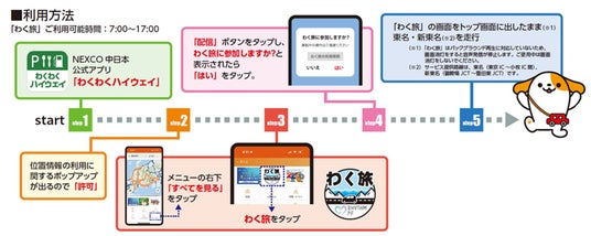 対象路線の東名・新東名を走行すると、車の位置情報に応じて最適なタイミングで「サービスエリア(SA)・パーキングエリア(PA)のおすすめ情報」・「高速道路の豆知識」・「地域情報」・「車窓からの景色のご案内」のほか「期間限定の特別情報」などを、NEXCO中日本公式アプリ「わくわくハイウェイ」を通してお客さまのスマートフォンから音声で配信します。