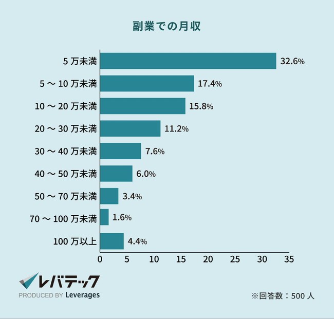 IT人材が副業を行う目的について、1位は「収入アップのため(59.2%)」でした。副業での月収は「5万円未満」が32.6%で最も多い結果となりましたが、月に10万円以上の収入を得ている方も約半数いることがわかります。
