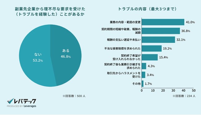 「副業先から理不尽な要求を受けた(トラブルを経験した)ことがあるか」という問いに対し、「ある」と回答した人は46.8%でした。具体的なトラブルの内容は「業務の内容・範囲の変更(41%)」が最も多く、「契約期間の短縮や破棄、報酬の減額(36.8%)」「報酬の支払遅延や未払い(32.1%)」が続きます。副業を新たに始める際には、契約内容を事前に取り決め書面に残しておくことや、中立の立場で調整してくれるエージェントを介して案件を受けるなど、予め対策をしておくことが重要になりそうです。