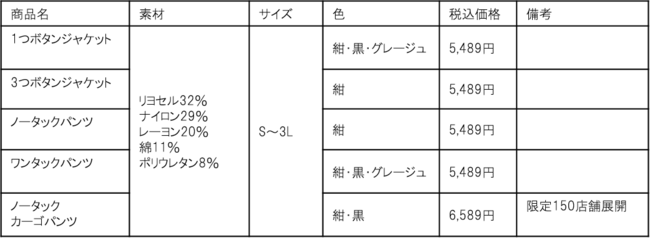 カラーはビジネスでも使いやすい定番の黒と紺に加え、春夏らしいグレージュの3カラー展開。型紙は、ジャケットはカーディガンのように羽織れる1つボタンジャケットと、より「きちんと感」のある3つボタンジャケット。パンツは「リラックス感」のあるワンタックパンツ、すっきり見えるノータックパンツと、カジュアルシーンで着やすいカーゴパンツをご用意。今まで以上にシーンレスに着まわせるラインナップを揃えております。