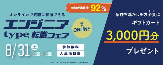 株式会社キャリアデザインセンターが運営する転職サイト『type』は、2024年8月31日(土)にオンラインで『type エンジニア転職フェア ONLINE』を開催いたします