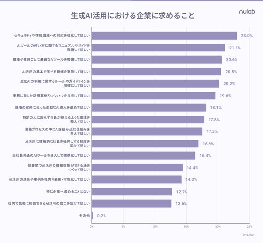 生成AI導入において企業に求める取り組みとして、「実務に即した活用事例やノウハウの共有」や「成果の可視化」を求める声が多く挙がりました。チームとしての活用方法が明確でないことが、導入後の活用定着を阻む要因となっていると考えられます。