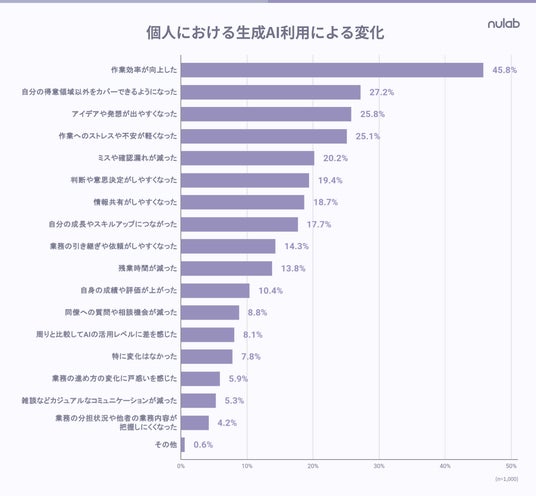 さらに、「同僚への質問や相談の機会が減った」と感じている層も一定存在しており、チーム内のコミュニケーションに影響を及ぼし始めている可能性が示唆されました。