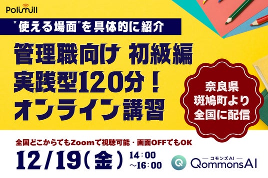 Polimill株式会社(本社:東京都港区、代表取締役:伊藤あやめ/谷口野乃花)は、奈良県斑鳩町で実施予定の管理職向け生成AI研修を、全国の自治体職員が参加できる「公開研修」として12月19日(金)14:00~16:00に開催します。本研修は、生成AIの基礎理解から日常業務での活用方法、議会答弁案の作成まで、管理職が“現場で使える力”を120分で身につけられる実践型プログラムです。自治体から寄せられる「庁内の活用を進めたい」「管理職層の理解を深めたい」といった“全国共通の課題”に応えるべく、斑鳩町様にご協力いただき、研修内容を“全国で共有できる価値”として公開することにしました。
