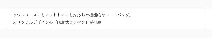 オリジナルデザインの脱着式ワッペンも付属、優れた収納力と機能性でマルチに使える商品です。