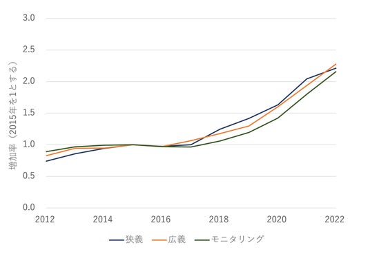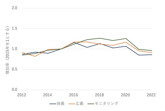 狭義と広義のネイチャーポジティブ領域では2020年に約2倍、モニタリング領域では2021年に2.8倍程度に増加しています。件数そのものは減少に転じているものの、2022年ではいずれも1.5倍以上の値であり、2015年と比較すると社会実装が大きく進んだことが読みとれます。