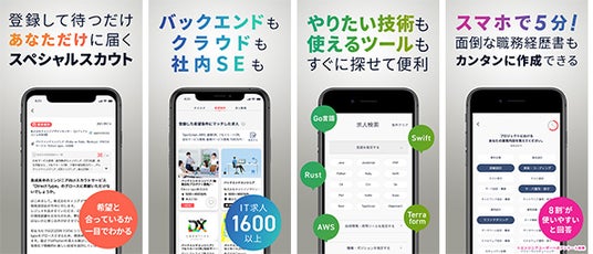 経験やスキル、希望職種などを登録しておくだけで企業から直接アプローチされるため、登録後は待つだけで転職活動を進めることができます。Direct typeの機能はすべてエンジニアナイズされており、職種から言語、使用技術とエンジニア向けの検索項目・登録項目が充実しています。経験や希望条件を詳細に登録することができるため、登録者×企業の高精度なマッチングが可能です。またiOSアプリでは項目を選んでタップしながら職務経歴書が作成できる簡単作成機能を搭載。多くの転職活動中のエンジニアに活用いただいています。