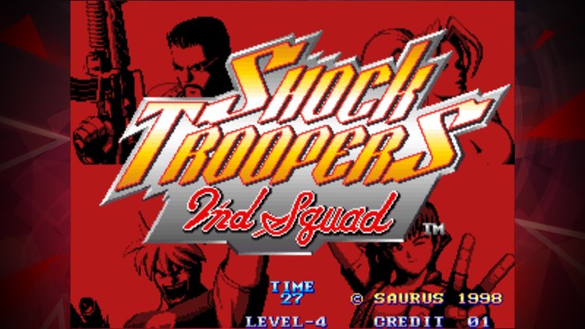 『ショックトルーパーズ セカンドスカッド』は1998年にSNKから発売されたミリタリーアクションゲームです。4人の傭兵が、巨大企業の野望を打ち砕くために立ち向かいます。メインショット、ウェポン、ジャンプ要素のほか、操作可能な乗り物の登場やルート選択があり、遊び応えのあるシステムとなっています。
