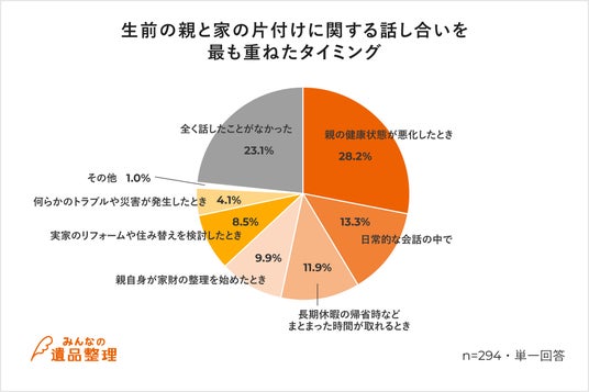 「生前の親と家の片付けに関する話し合いを最も重ねたタイミング」を伺う設問では、「親の健康状態が悪化したとき」が28.2%と最多で「日常的な会話の中で」が13.3%「長期休暇の帰省時などまとまった時間が取れるとき」が11.9%と続きました。