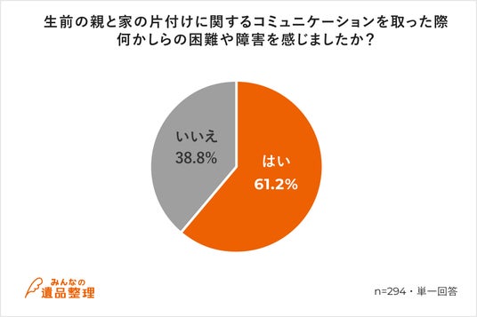 ご両親またはどちらかの逝去に伴い遺品整理を経験した方(294名)を対象に「生前の親と家の片付けに関するコミュニケーションを取った際の困難や障害の有無」を伺ったところ、61.2%もの方が何かしらの困難や障害を感じていたことが分かりました。