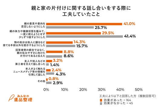 片付けに関する話し合いを生前の親とする際にしていた工夫については、「親の意見や意向を否定しない」が最も多く、「親の体力や健康状態を鑑みて、一度に終えようとせず少しずつ話し合うようにした」「物の処分は他人に譲るなど捨てる手段以外を提示するようにした」が続きました。