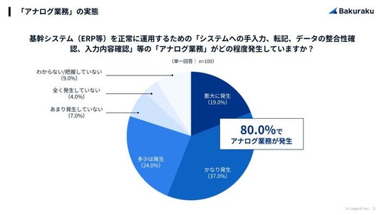 すべての経済活動のデジタル化を目指す株式会社LayerX(本社:東京都中央区、代表者:代表取締役CEO 福島良典、以下「LayerX」)は、経営企画・経理/財務・情報システム部門を管掌する従業員規模2,000人以上の大企業幹部100人を対象に、基幹システム運用に伴う「アナログ業務※1」と経営スピードに関する実態調査を実施しました。