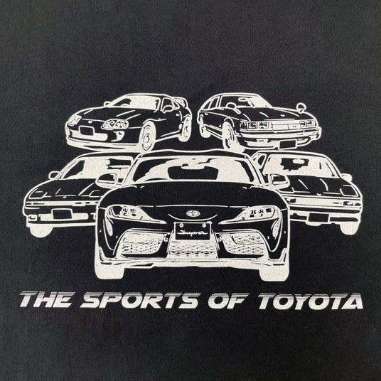 歴代のトヨタ スープラがずらりと並ぶイラストが入ったシンプルで遊び心のあるウェアをハイクオリティの材質で仕立てております。