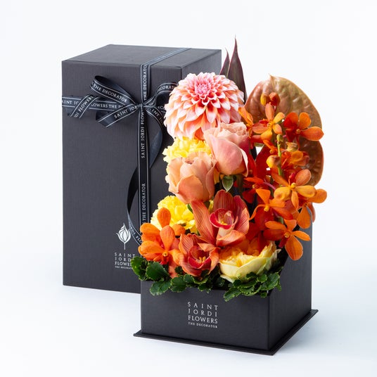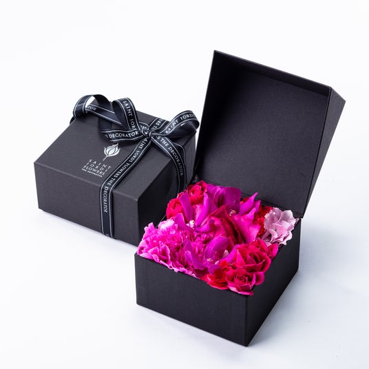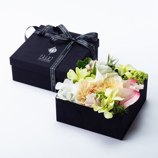 W24×D24×H9(cm)Precious Box Box プレシャスボックス ¥22,000レザーのような風合いの高級感あふれるフラワーボックス。一枚の絵を描くように、独特な立体感にダイナミックかつ繊細にアレンジされた花々で特別なギフトに仕上げます。