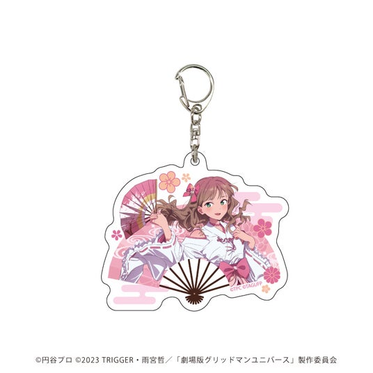C賞は、大きさおよそ6.5cm×6.5cmのアクリルキーホルダー! 扇子にヒロインたちを描いたデザインで、巫女服とあわせて和風な雰囲気がさらにアップしました。