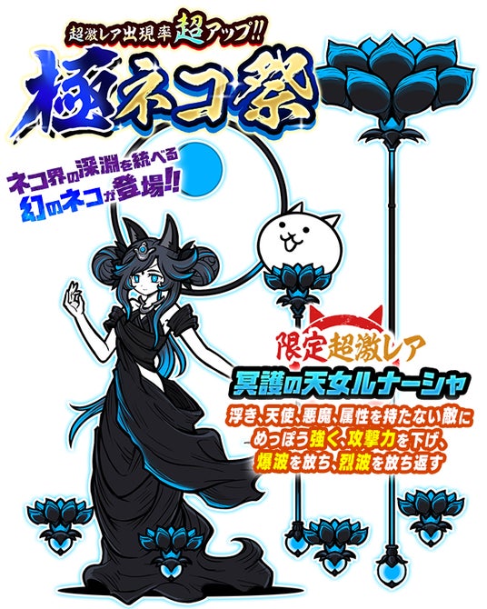 超激レア出現率が超アップするレアガチャ「極ネコ祭」に、限定キャラクター「冥護の天女ルナーシャ」が登場します。
