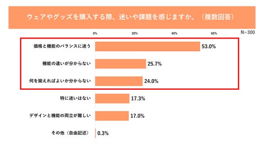 三つ目は、「選択」に伴うストレスです。運動を始める際のアイテム選びにおいて、53.0%が「価格と機能のバランスに迷う」と回答しており、「何を揃えればよいか分からない(24.0%)」といった不安も含め、運動を開始する前の「選択」という工程自体も心理的コストとなっている実態が判明しました(図10参照)。