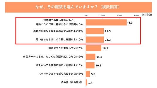まず一つ目は、「着替え」という準備コストです。運動時の服装について尋ねたところ、50.0%と半数が「普段着・部屋着のまま運動している」と回答(図7参照)。その理由としては「短時間での軽い運動が多く、運動のためだけに着替えるのが面倒だから」(48.3%)が最も多く、次いで「運動の前後もそのまま過ごせる服がよい」(21.3%)、「思い立ったときにすぐ動ける服がよい」(21.3%)といった声もそれぞれ約2割にのぼりました(図8参照)。
