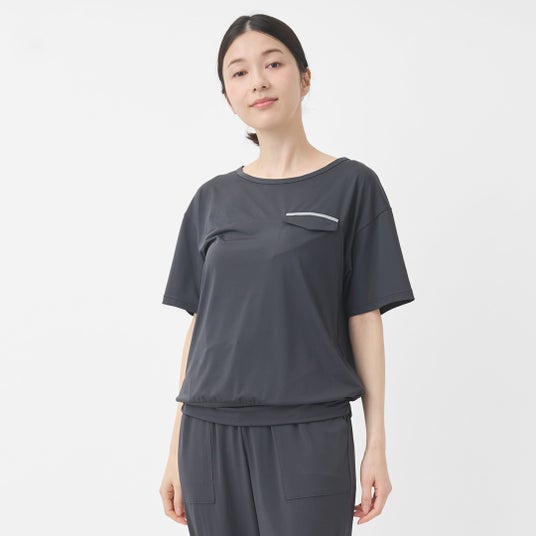 本格的な運動に一歩踏み出したい方向け、伸びのいい機能素材と全体のギャザーがおなか周りをカバーしつつ、すっきりとしたシルエットが特徴です。