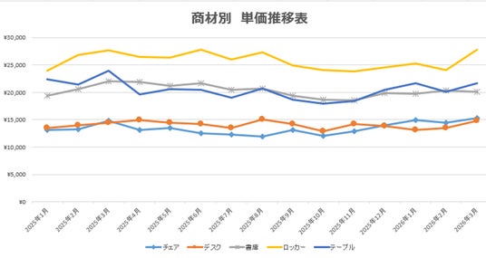 3月は、例年通り年間でもっともオフィス需要が活発化する時期となり、中古オフィス家具市場でも単価・販売数ともに前年比で伸長しました。チェア・デスク・ロッカー・テーブルを中心に、特定カテゴリへの集中ではなく全体として需要が広く立ち上がっている点が今月の特徴です。