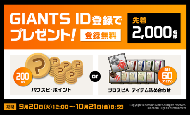 キャンペーン期間中、パワスピ・ポイントクラブ会員がキャンペーンページから「CLUB GIANTS」のGIANTS IDを新規登録(登録無料)していただくと、先着2,000名に「パワスピ・ポイント200pt」または「『プロ野球スピリッツA』のゲーム内アイテム詰め合わせセット(合計60アイテム)」をプレゼントします。