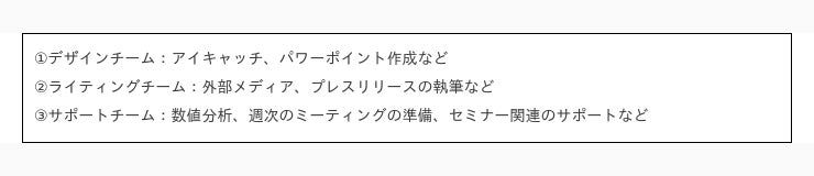 小澤・中野は、外部の方とのやりとり・商談・取材対応・戦略を練ることに注力し、それ以外の部分はアシスタント含め、以下の3つのチームメンバーに業務を依頼し分担しながら広報活動を推進しています。