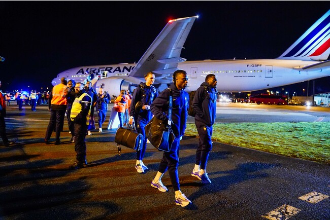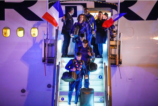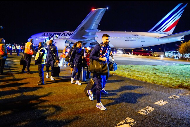 フランス代表チームの、オリヴィエ・ジルー、キングスレイ・コマン、そしてスティーヴ・マンダンダが、ルイ・ヴィトン FIFAワールドカップ 2022™ 公式ライセンス製品のコレクションである、特別な「キーポル 50」と共に帰国しました。