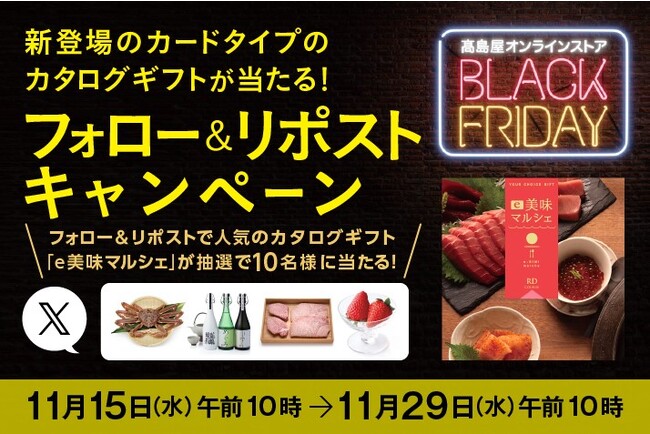 高島屋オンラインストアのX(旧twitter)公式アカウント(@takashimayaOS)をフォローしていただき、会期中、指定のキャンペーン投稿をリポストしていただくと、素敵なプレゼントが当たるチャンスをご用意。抽選で10名様に、高島屋のカードタイプのグルメカタログギフト「e美味マルシェ」(※)をプレゼントいたします。