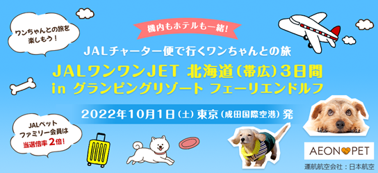 日本航空株式会社(本社:東京都品川区、代表取締役社長:赤坂 祐二)、株式会社ジャルパック(本社:東京都品川区、代表取締役社長:平井 登)、イオンペット株式会社(本社:千葉県市川市、代表取締役社長:米津 一郎)は、10月1日(土)出発の2泊3日で、愛犬と機内(客室内)で一緒に過ごせる往復チャーター便を利用したツアー「JALワンワンJET 北海道(帯広)3日間」を、8月9日(火)14時より発売開始します。