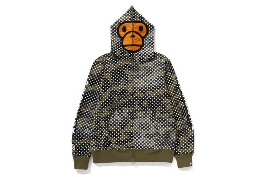 “MILO FACE”タイプのフルジップフーディーは、BAPE(R) CAMOの上から、ヴィーダスがドットを描きました。さらに、“A BATHING APE(R)”や“BABY MILO(R)”のロゴを縁取りしてクラフト感を演出しています。