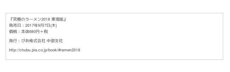 今年の必食523杯が掲載されている「究極のラーメン2018東海版」が発売!おトクなサービスが受けれる180枚のクーポンに、ニューオープンも104軒ご紹介。また今年はラーメン好き女子おすすめの店舗も。さらに目玉企画である「究極のラーメンAWARD」が今年も開催されます。今年のグランプリは・・・? ラーメン好き必携の1冊です!