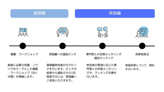 県内でスタートアップ企業の創業を目指す方や、県内スタートアップ企業を運営する創業間もない法人を対象とした支援プログラムです。「基礎編」と「実践編」にプログラムが分かれており、「基礎編」では創業に必要な知識・ノウハウなどをテーマとした講義・ワークショップの開催を通じて、事業計画の策定をサポートします。「基礎編」の参加者には、プログラムの最後にピッチを行っていただきます。ピッチの結果から選抜された5名程度の方を対象にした「実践編」では、メンタリング支援を通じてビジネスの構築・課題解決を目指すとともに、スタートアップの事業成長を支援します。