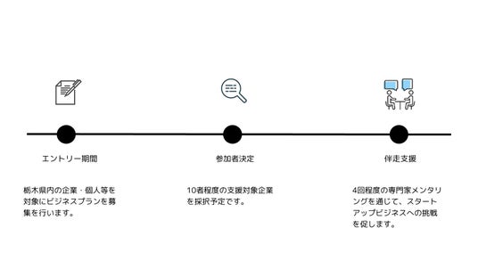本事業は、栃木県内でスタートアップの創業を目指す方やスタートアップ企業等を対象とした事業です。事業やアイデアのフェーズ・現在の事業形態に合わせて、(1)課題解決型人材育成事業、(2)スタートアップ企業成長加速支援事業、(3)潜在スタートアップ企業支援事業の3つのプログラムを展開します。それぞれに合った支援を行うとともに、栃木県内のスタートアップエコシステムの更なる発展を目指します。