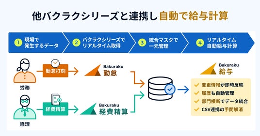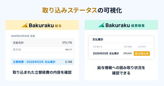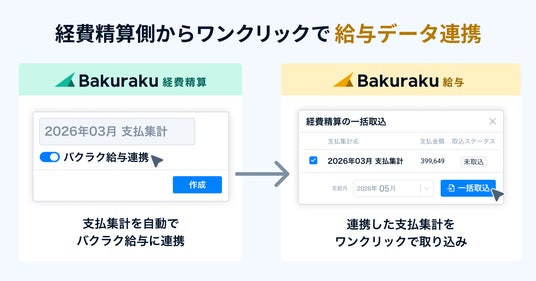 株式会社LayerX(本社:東京都中央区、代表取締役CEO:福島良典、以下「LayerX」)は、給与計算サービス「バクラク給与」において、経費精算サービス「バクラク経費精算」で作成された支払集計データをワンクリックで給与計算に取り込める「経費精算連携機能」の提供を開始しました。また、勤怠管理サービス「バクラク勤怠」との連携により、月次の勤怠締め後に労働時間・残業時間・有休取得日数などの勤怠情報が給与計算へ自動で取り込まれる「勤怠連携機能」も提供します。