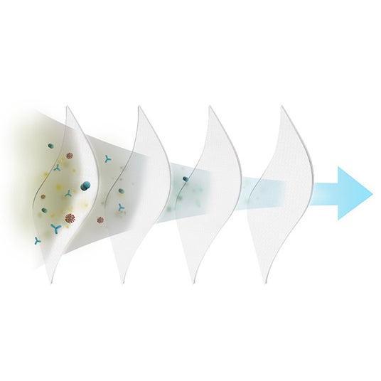 極細繊維素材で微小粒子をカット。フィルターを2枚重ねた、4層構造