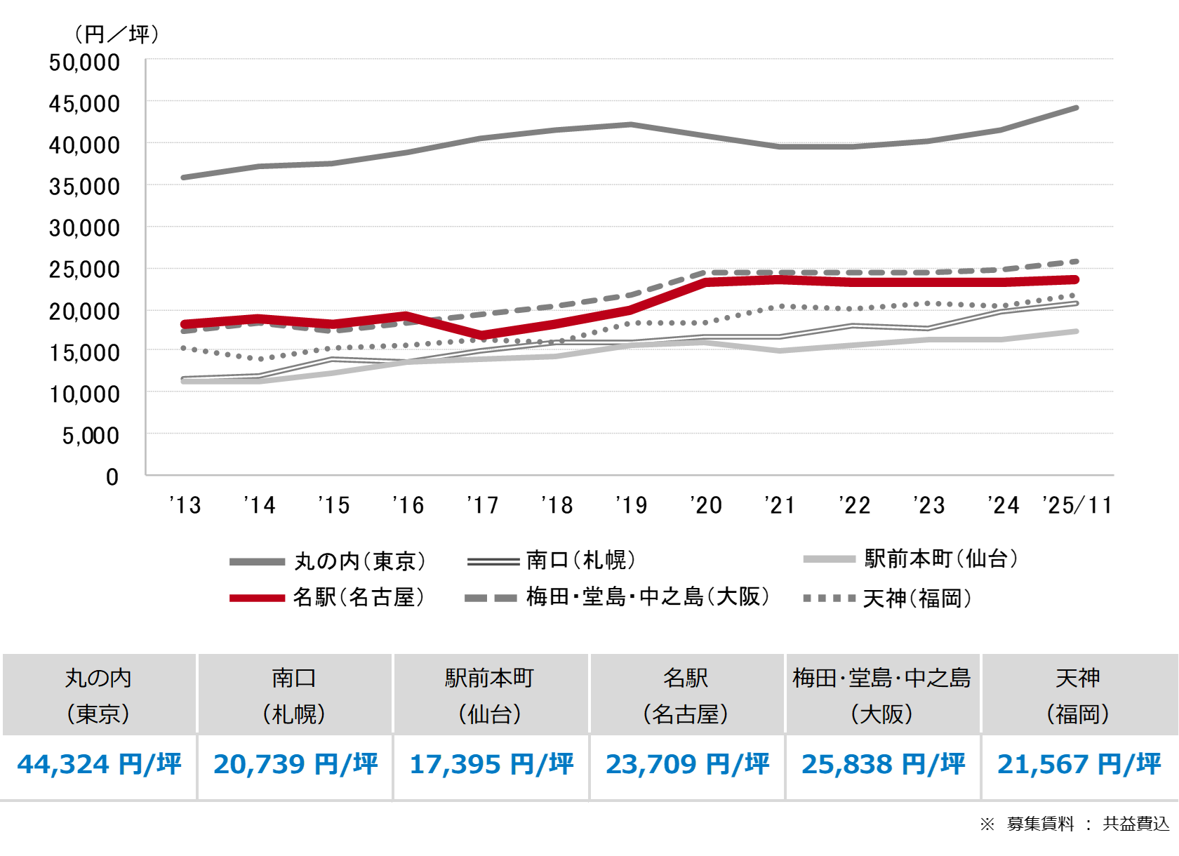 三幸エステート株式会社(本社:東京都中央区、取締役社長:福島正二郎)は、2025年11月度の名古屋市オフィス賃貸状況(空室率&現空面積:全規模、募集賃料&募集面積:全規模、規模別空室率、主要エリア※1空室率:全規模)および全国6大都市(東京・札幌・仙台・名古屋・大阪・福岡)の大規模ビルのマーケットデータをまとめた「オフィスマーケット2025年12月号名古屋」を公表します。