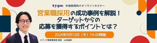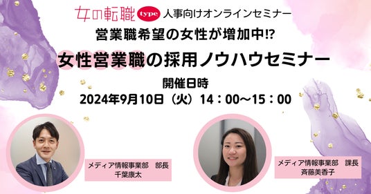 転職サイト「女の転職type」では、9/10(火)14時より営業職希望の女性が増加中!? 女性営業職の採用ノウハウセミナーの録画配信を開催いたします。