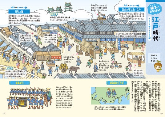 各時代の生活や雰囲気がわかるイラストと、おはなしの内容を深掘りした解説がついています。「この時代の食べ物は?」「身近なあれっていつできたの?」など親子で話すきっかけになります。「行ってみよう」では、歴史の舞台となった場所など、その時代をより詳細に学ぶことができるスポットを紹介しています。