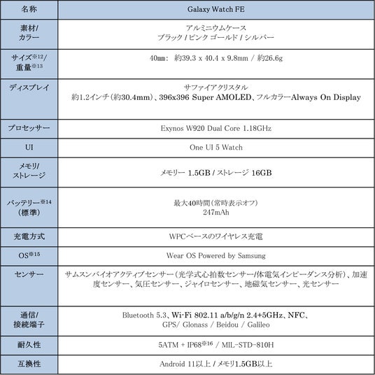 <主な仕様:Galaxy Watch FE (Bluetooth)>