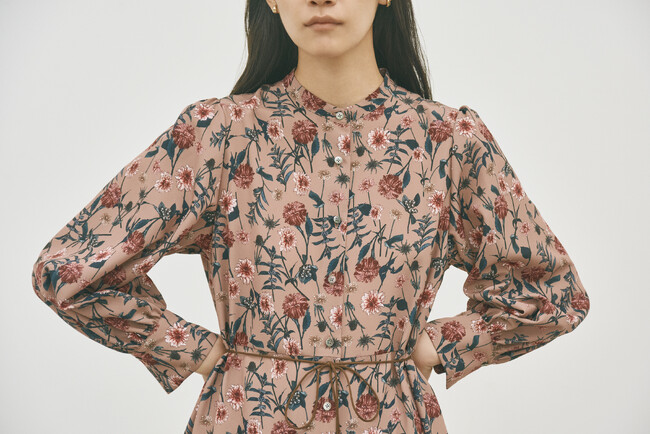 本コラボレーションのためにオリジナルで制作したスペシャルな柄『Winter Garden』は、秋から冬にかけて咲くノスタルジックなダリアの花びらやスモーキーなユーカリの質感をグラフィックで美しく表現。さまざまなテクスチャーがまじりあう、豊かな花々の表情が秋冬のグレイッシュな世界観に彩りを添える、オリジナルプリントです。
