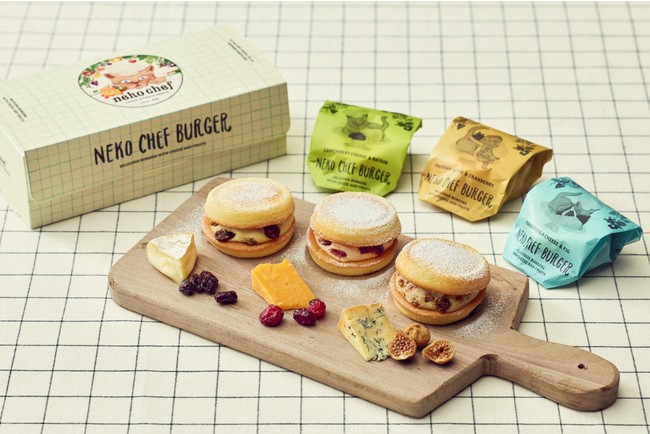 ネコシェフの自信作。チーズフルーツバーガー。ご主人自慢のチーズの薫りと森の果実を贅沢に使用し、クリームチーズを練り込んだしっとり生地でサンドしました。 [カマンベール&レーズン、チェダー&クランベリー、ゴルゴンゾーラ&イチジク 各1個]