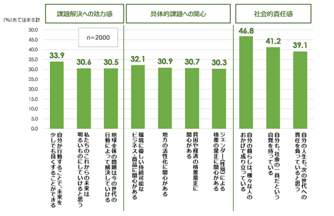 - ソーシャル・エンゲージメントは、「課題解決への効力感」「具体的課題への関心」「社会的責任感」の高さを、以下の項目で聴取。