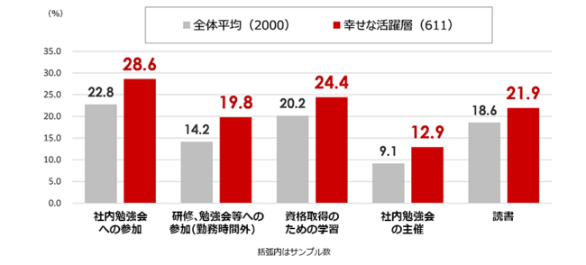 幸せな活躍層のソーシャル・ラーニングの具体的な行動割合は、全体平均のおよそ2倍。【図表4】