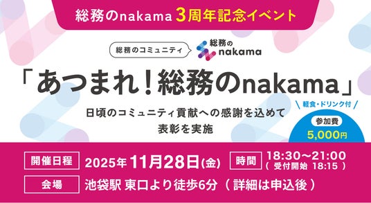 株式会社Wiz(本社:東京都豊島区、代表取締役社長:山崎 俊)は、総務・バックオフィス向けコミュニティ「総務のnakama」の3周年を記念し、交流イベント『あつまれ!総務のnakama ~3rd anniversary~』を2025年11月28日(金)に開催いたします(※)。