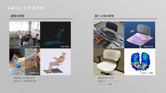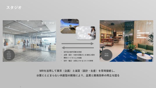 2階は、設計・開発メンバーをはじめ、他拠点や異部署のメンバーが集い、議論と検証を行う社内共創フロアです。開発ラボ、エルゴノミクスラボ、スタジオを集約し、アイデア検討から試作・評価までを一連の流れで行える環境を整備しました。エルゴノミクスラボでは、モーションキャプチャーやシートトレーサーを用いた身体データに基づく検証を実施。スタジオではMRを活用し、企画部門のある東京と設計・生産部門のある滋賀を接続しています。拠点や部門を越えた共創型の開発を日常化し、開発の質とスピードの向上を図っています。