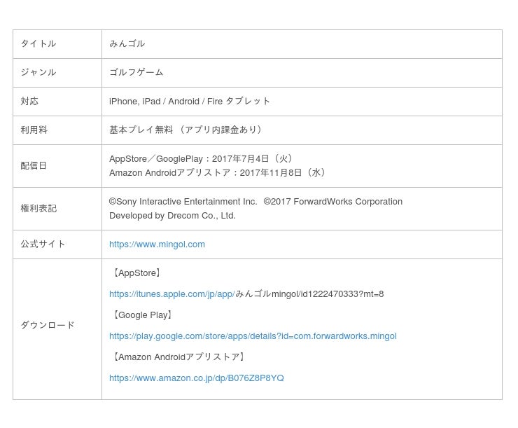 『みんゴル』は、「プレイステーション」を代表する作品のひとつ「みんなのGOLF」シリーズの“誰でも簡単にゴルフゲームを楽しめる”というコンセプトを、スマートフォンの特性や、プレイスタイルに合わせて最適化し、誰もが、いつでもどこでも、爽快ショットで手軽にゴルフゲームをお楽しみいただけます。