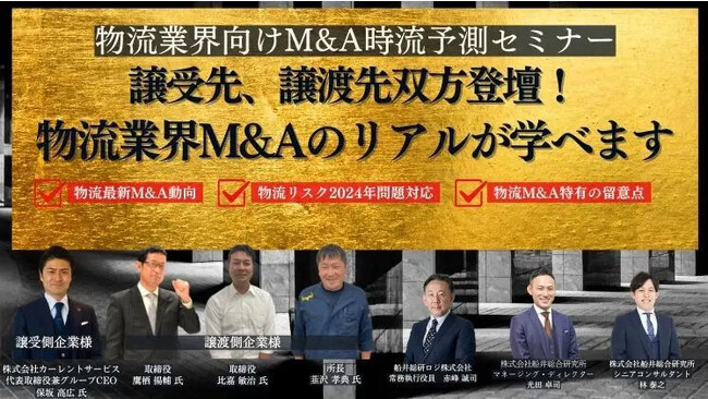2023年11月28日開催『第1回 物流業界向けM&A時流予測セミナー(主催:株式会社船井総合研究所)』にて、当社取締役 赤峰 誠司が登壇し、物流業界のM&A・事業承継についてくわしく解説します。