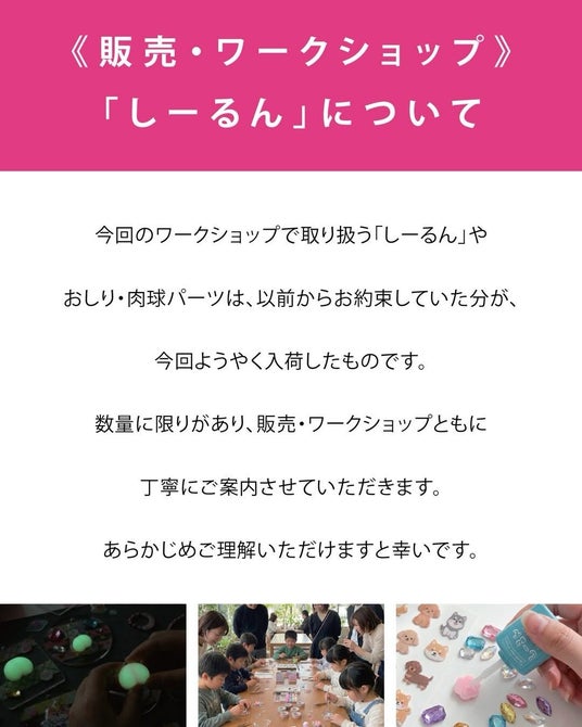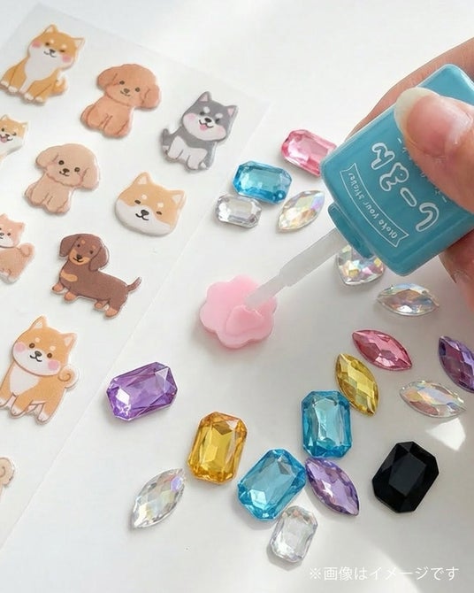 ワークショップでは、おしりパーツや肉球パーツをはじめ、キラキラとしたデコパーツやシール素材を自由に選び、透明なアクリルプレートを自分だけのデザインに仕上げていきます。
