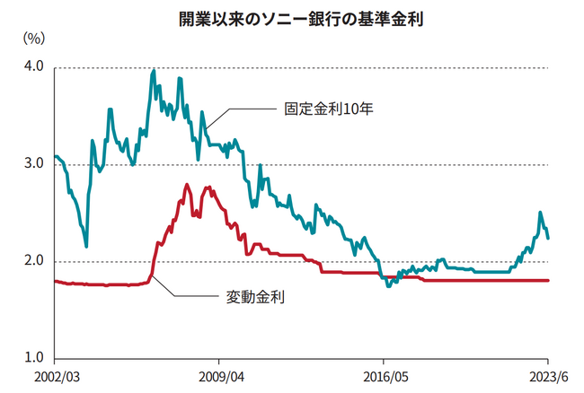 開業以来のソニー銀行の基準金利です。変動金利は依然として低金利が続いていますが、固定金利には動きがみられます。実際にご利用いただく金利は、基準金利から所定の引下幅が適用された金利になります。