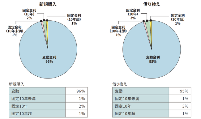 ・ 金利タイプ別では、新規購入、借り換えともに9割以上が変動金利を選択